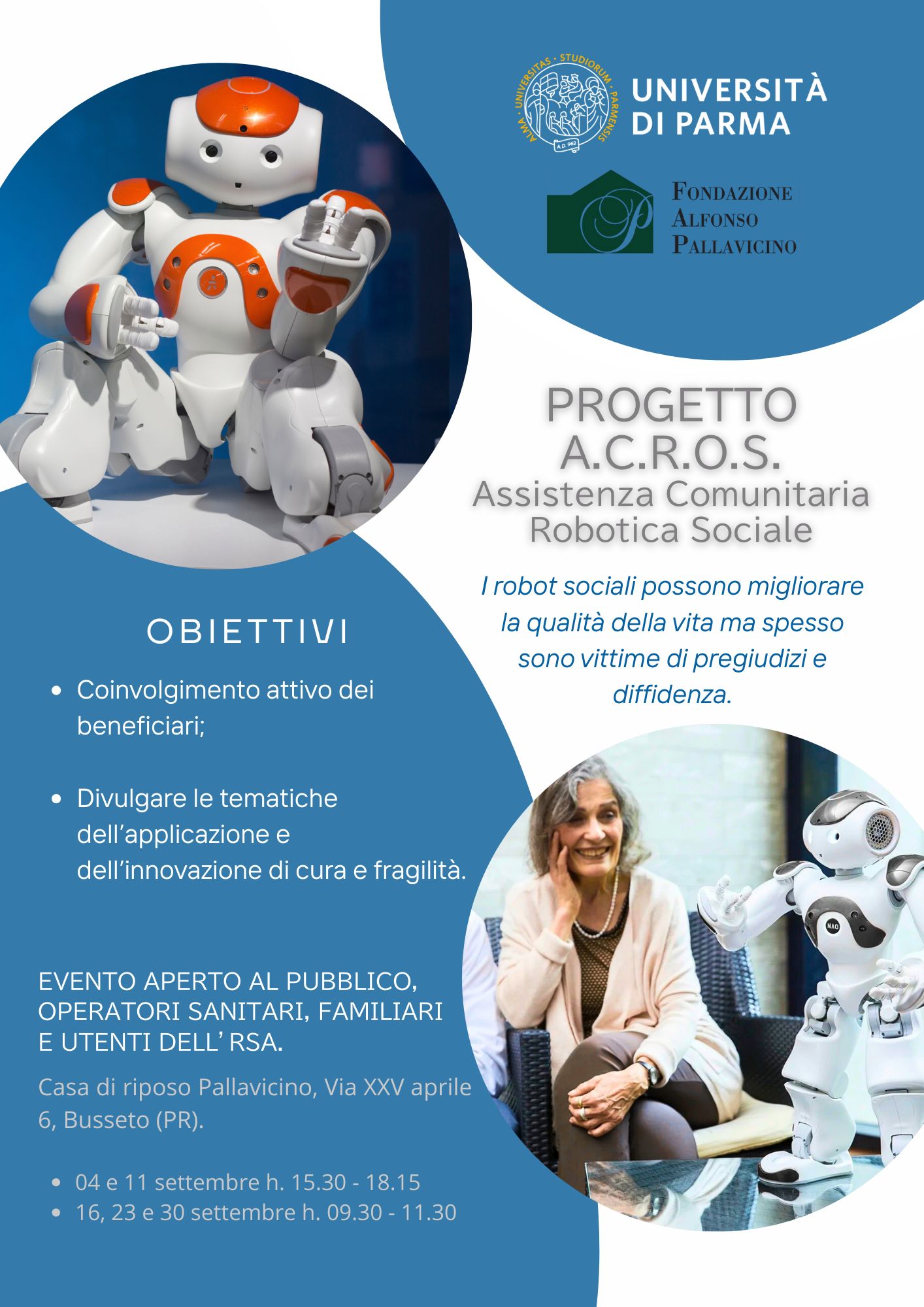 Il laboratorio di Psicologia cognitiva dell’Università di Parma terrà una serie di eventi divulgativi presso la Casa di Riposo della Fondazione Alfonso Pallavicino aperti al pubblico, operatori sanitari, familiari e utenti per spiegare gli obiettivi che la robotica sociale si prefigge di raggiungere e le funzionalità che i robot possono assolvere.